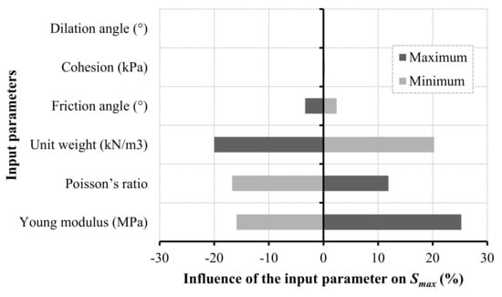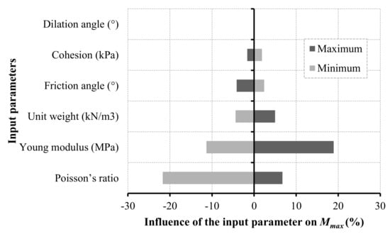 In order to evaluate the input parameters’ influence on the system behavior, the values of the two output parameters (Mmax and Smax) are deduced by using numerical calculations for the reference case. The obtained values are: Sref = 12.44 mm and Mref = 30.18 kN·m. Then, numerical calculations were done to study the influence of each input parameter in a given range defined by its minimum and maximum values (Table 3). When studying the influence of a parameter, the other parameters are kept at their reference value. The results of this parametric study are shown in Figure 6; Figure 7. The soil parameters which have the main influence on Smax are the soil unit weight, Young’s modulus, and Poisson’s ratio. For the Mmax, only the Poisson’s ratio and Young’s modulus have significant impacts. It is noted that the calibration parameters (effective reference pressure pref, calibration factor β, and failure rate Rf) are remained constant in the parametric studies.