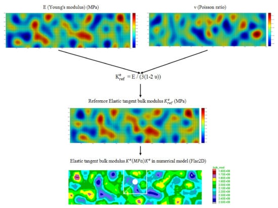 The lognormal distribution defines the spatial variability of the soil parameters (E, ν and γ). The following parameters were considered: μE = 150 MPa, COVE = 15% [,,], μν = 0.3, COVν = 5% [], μγ = 17 kN/m3, and COVγ = 10% [,] with an autocorrelation distance equaling to 1.0 m in both directions and a second-order exponential autocorrelation function. Figure 8 shows a random field for the tangent bulk modulus.