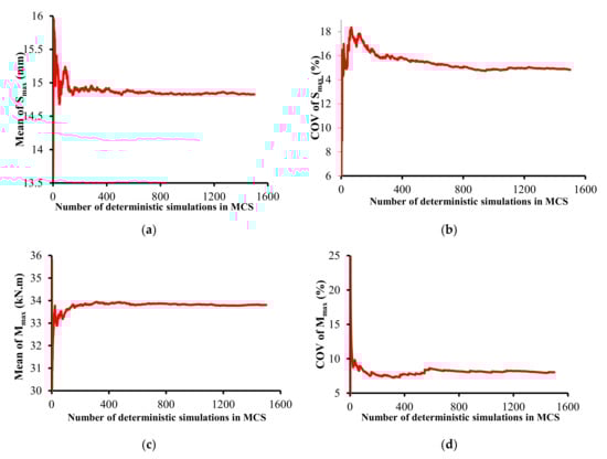 The effect of the soil spatial variability on the surface maximum settlement and the liner maximum moment is evaluated using the MCS for several combinations of autocorrelation distances in both directions (x and y). For each studied combination, MCS requires the generation of a large number of samples. Each one is represented by a random field realization. The maximum settlement (Smax) and the liner maximum tunnel lining moment (Mmax) are then calculated for each of these realizations. The means (μSmax, μMmax) and the standard deviations (σSmax and σMmax) of all the values for the two quantities of interest are then compared. The required number N of simulations is determined by regarding the convergence of the two statistical moments. Figure 9 illustrates both the variations of the calculated means and of the COV with respect to the simulation number N. It is observed from Figure 9 that the variation of the means and of the COV is <2% when N is higher than 800. Consequently, convergent solutions of these two statistics can be obtained roughly at 800 simulations. Thus, N = 800 is adopted for the following MCS-based probabilistic analysis. It should be noted that N = 800 is only sufficient for the analysis of the mean and the COV of the behavior of the tunnel in this study. It may not be sufficient to estimate low probabilities of failure when the strain limit is strict in tunnel engineering.
