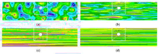 Generated random fields of Young’s modulus using different autocorrelation distances: (a) Lx = 1 m, Ly = 1 m; (b) Lx = 10 m, Ly = 1 m; (c) Lx = 100 m, Ly = 1 m; (d) Lx = 200 m, Ly = 1 m.
