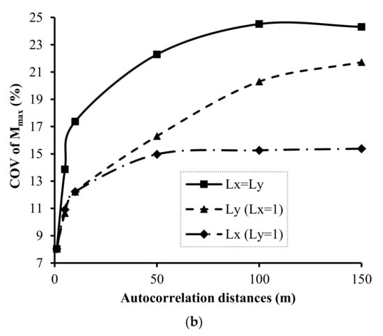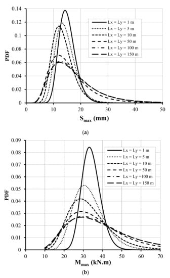Figure 11 provides the PDF of Smax and Mmax for different cases of isotropic random fields (Lx = Ly = 1, 5, 10, 50, 100, and 150 m). Figure 11 shows that the PDF is less spread out when the autocorrelation distance decreases. On the other hand, for large values of the autocorrelation distance, the standard deviation tends towards a maximum value.
