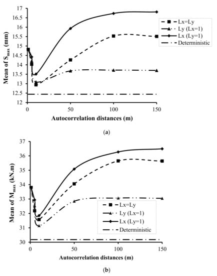 For greater autocorrelation distances: For the case of a single direction, the columns and the layers of soil alternately form large and small values of E, ν, and γ. A stabilizing barrier for the movements of the ground is constituted by the zones of the ground with a high E, ν, and γ value. It induces a small value of Smax and Mmax and a more stable structure. As for cases with very high autocorrelation distances (e.g., Lx = Ly = 150 m), the soil is close to be homogeneous. In this case, Smax and Mmax have a difference of 24.67% and 18.09% respectively compared to the deterministic results.