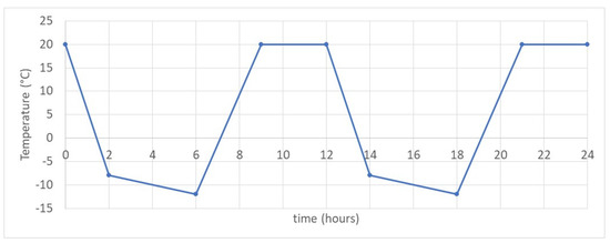 The 34 samples were submitted to freeze/thaw cycles following the European Standard NF EN 12,371 [27] which measures the frost resistance of natural stone by a test comprising 2 cycles a day FT cycles, as described in Figure 1.