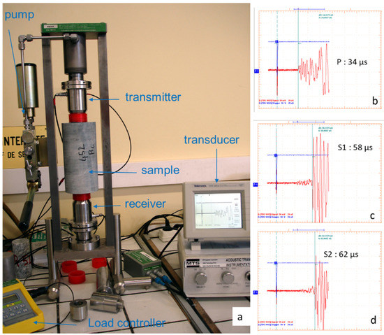 Experimental device (a) and representative waveforms of the receive signal: (b) P-wave, (c) S1-wave and d S2-wave. On (b–d): in blue the electric pulse and in red, the received signal.