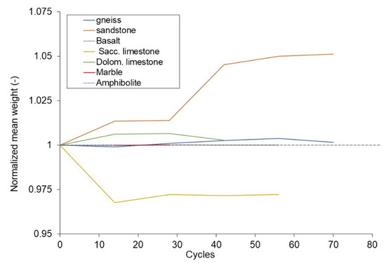 Evolution of the normalized mean weight of the samples. Values are normalized by the initial mean—the dot line corresponds to constant weight. Amphibolite and marble do not vary, their curves are hidden by basalt.