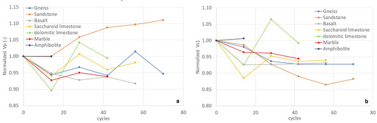 Figure 5 and Figure 6 present the evolution of the elastic waves’ velocities measured in the samples during the experiment. Figure 5 presents the evolution of the normalized mean P-waves and S1-waves for all the rock types while Figure 6 presents the evolution, of the mean value together with the min and max registered to illustrate the spread of results. Values are normalized by the initial mean.