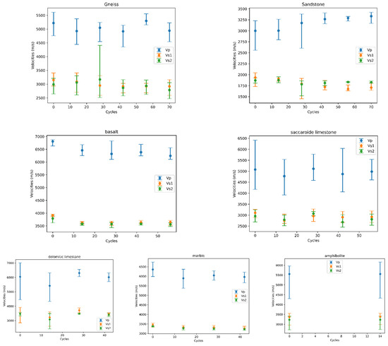 Evolution of the velocities of elastic waves for the tested rocks (Vp in blue, Vs1 in orange and Vs2 in green) max, mean and min values are given to illustrate the spread of results. The rock type is mentioned above each graph.