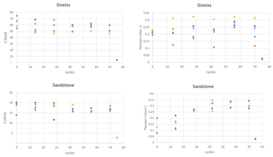 Evolution of dynamic Modulus (a,c) and Poisson’ ratio (b,d) calculated according to Equations (1) and (2) for gneiss (a,b) and sandstone (c,d) samples.