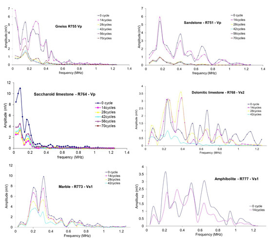 - Marble: when FT cycles increase a regular decrease of the Vp, Vs1 and Vs2 amplitudes is obtained;