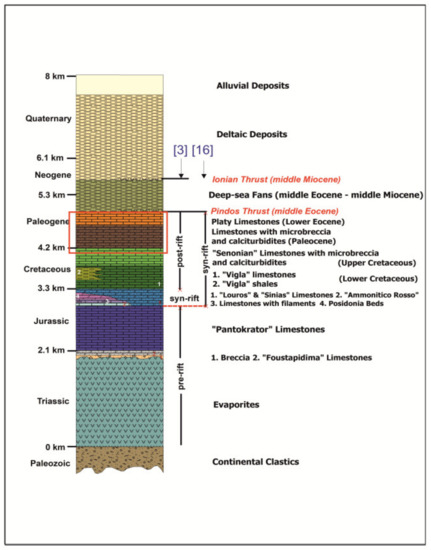 These rocks are exposed on the surface only in the highly tectonized zones, where they have been transformed into a brecciated evaporitic dissolution formation known as Triassic breccia and gypsum [33,34]. They are overlain by the “Foustapidima” (Ladinian to Rhaetian) limestones and above them the “Pantokrator” Limestones (Hettangian to Sinemurian) occur [6,8,11] (Figure 2). From the late Early Jurassic (Pliensbachian) begins the syn-rift process when the initial shallow platform was submitted to extension, which caused a structural differentiation (shredding) into small sub-basins and started a general deepening, resulting in the formation of a deep basin [2,3,19,20]. At the base, the syn-rift sequence consists of the upper Lower Jurassic (Pliensbachian) pelagic “Siniais” limestones Formation and their lateral equivalent, the hemipelagic “Louros” limestones Formation which contain abundant ammonites, brachiopods, and foraminifera. These deposits are overlain by the Lower to Upper Jurassic (Toarcian to Tithonian) “Ammonitico Rosso”, “Filamentous limestones” and “Posidonia shales” Formations (Figure 2). The thickness variations across the basin are due to the tectonic shredding, and so different basin depths are observed. The Upper “Posidonia shales” represent the deposition during the Callovian-Kimmeridgian interval [2,18,20].
