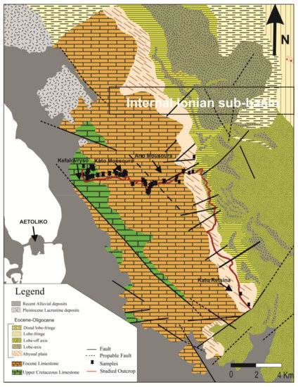 - Bourli, N.; Pantopoulos, G.; Maravelis, A.G.; Zoumpoulis, E.; Iliopoulos, G.; Pomoni-Papaioannou, F.; Kostopoulou, S.; Zelilidis, A. Late Cretaceous to Early Eocene geological history of the eastern Ionian Basin, southwestern Greece: An integrated sedimentological and bed thickness statistics analysis. Cretac. Res. 2019, 98, 47–71. [Google Scholar] [CrossRef]