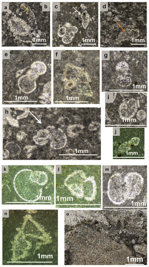 - Flügel, E. Microfacies of Carbonate Rocks, 2nd ed.; Springer: Berlin/Heidelberg, Germany, 2010; p. 984. [Google Scholar] [CrossRef]