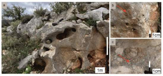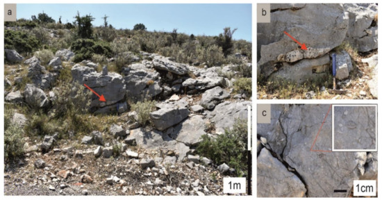 (a) General view of the Upper Cretaceous (Maastrichtian) brecciated limestones outcrop with Rudist fragments, (b,c) Rudist fragments (red arrow).