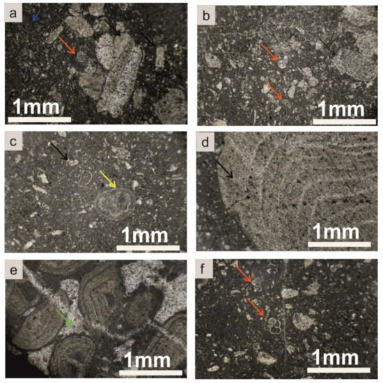 Microfacies type F1: Allochthonous, bioclastic-lithoclastic packstone/floatstone microbreccia of Eocene age. (a) bioclasts (black arrow), benthic foraminifera (white arrow), planktic foraminifera (red arrow), sample M6, (b) bioclasts (black arrow), benthic foraminifera (white arrow), planktic foraminifera (red arrow), sample M12, (c) bioclasts (black arrow), planktic foraminifera (red arrow), benthic foraminifera (white arrow), oolitic grainstone and coated grains (green arrow), sample M6, (d) bioclasts (black arrow), benthic foraminifera (white arrow), micritic clasts (blue arrow), algae (orange arrow), sample M5.