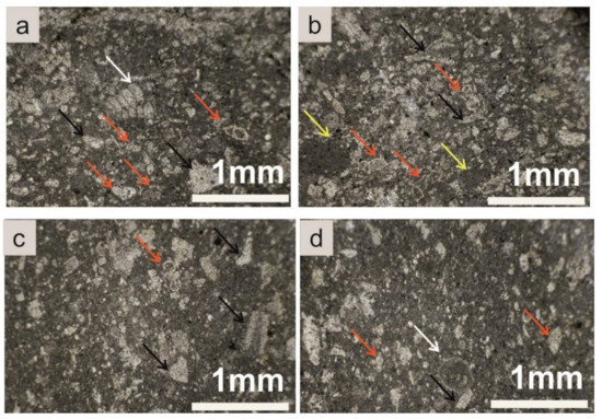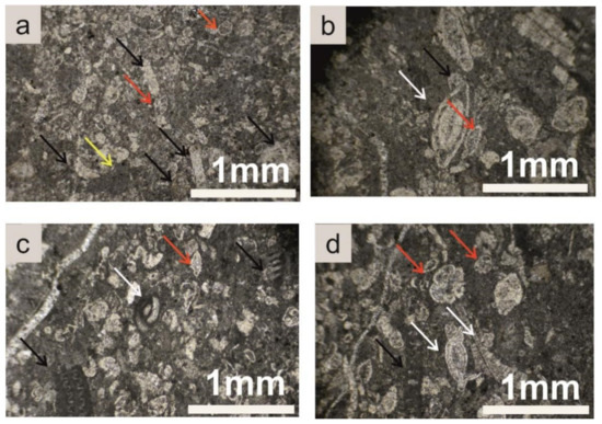 Microfacies type F2: Polymict clast supported microbreccia of Paleocene age. (a) planktic foraminifera (red arrow), bioclasts (black arrow), benthic foraminifera (white arrow), micritic clasts (yellow arrow), sample KM10, (b) planktic foraminifera (red arrow), bioclasts (black arrow), Miliolidae (white arrow), sample KM9, (c) planktic foraminifera (red arrow), bioclasts (black arrow), benthic foraminifera (white arrow), sample KM8, (d) planktic foraminifera (red arrow), bioclasts (black arrow), benthic foraminifera (white arrow), sample KM8.