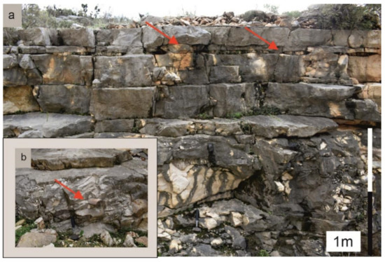(a) General view of the outcrop of the Maastrichtian micritic limestones where nodules and thin layers of chert (red arrow) locally occur, (b) chert Nodules (red arrow).