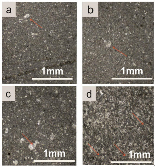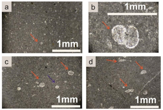 Microfacies type F3: Mudstone/wackestone with planktic foraminifera (red arrow) of Maastrichtian age. (a) mudstone with planktic foraminifera (red arrow), sample K9, (b) mudstone with planktic foraminifera (red arrow), sample K9, (c) mudstone with planktic foraminifera (red arrow), sample K10, (d) wackestone with planktic foraminifera (red arrow), sample K11.