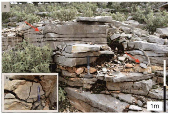 (a) General view of the outcrop of the Paleocene micritic limestones where nodules and thin layers of chert (red arrow) locally occur, (b) closer view of a Microbreccia limestone.