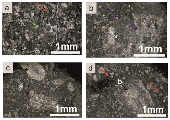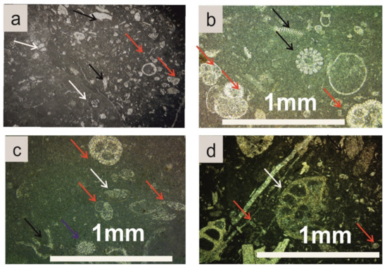 Microfacies type F2: Polymict clast supported microbreccia of Eocene age. (a) planktic foraminifera (red arrow), bioclasts’ debris (black arrow), benthic foraminifera (white arrow, sample M16, (b) planktic foraminifera (red arrow), bioclasts’ debris (black arrow), sample M15, (c) planktic foraminifera (red arrow), bioclasts’ debris (black arrow), benthic foraminifera (white arrow), radiolaria (purple arrow), sample M16, (d) planktic foraminifera (red arrow), bioclasts’ debris (black arrow), benthic foraminifera (white arrow), sample M17.