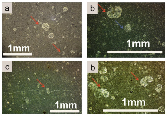 Microfacies typeF3: Mudstone/wackestone with planktic foraminifera of Eocene age. (a) planktic foraminifera (red arrow), sample KM1, (b) planktic foraminifera (red arrow), radiolaria (blue arrow), sample M20, (c) planktic foraminifera (red arrow), sample M4 (d) planktic foraminifera (red arrow), sample M4.