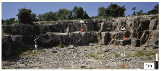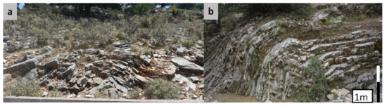 The Upper Cretaceous (Maastrichtian) carbonate succession or “clastic limestones” [14], where according to field observations, consists of thick-bedded, white to white-yellow in color brecciated limestones with Rudist fragments and angular and boulder size clasts derived from underlying rocks-beds. Chert nodules have been occasionally observed as well (Figure 5).