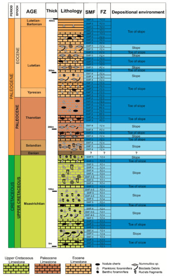 - During the upper part of the lower Eocene (Lutetian) in the study area, toe-of-slope (FZ: 3) is not the only depositional setting that has been recognized. The presence of SMF 4 and SMF 5 microfacies types has been also noticed, which are attributable to shallower environments such as a slope (FZ: 4) and are in accordance with field observations (Figure 24), where thick bedded microbreccia limestones were deposited. Specifically, microfacies SMF 5 is composed of packstones/rudstones with planktic foraminifera in combination with transported components deriving from a relatively shallow environment such as a shallow carbonate platform. These components consist of scattered benthic foraminifera such as Nummulites sp., Discocyclina sp., Quiqueloculina sp., Alveolina sp., as well as algae and bivalve debris, indicating a relatively high energy environment. Additionally, SMF 4 is represented by polymict clast supported microbreccia consisting of carbonate litho- and bioclasts with scattered planktic and benthic foraminifera, indicating a slope depositional environment (FZ: 4). This microbreccia derived from the erosion of the Cretaceous carbonates from the Gavrovo platform to the east.
