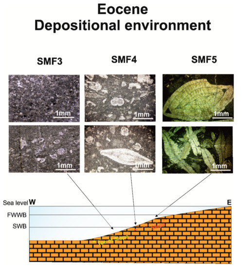 During the Eocene Epoch the “platy limestones” [16,17,18] that were deposited are characterized by nodular cherts and are represented by wackestone-packstone biomicrites (SMF3). This microfacies type is attributable to a deep-sea up to a toe-of-slope environment [19].