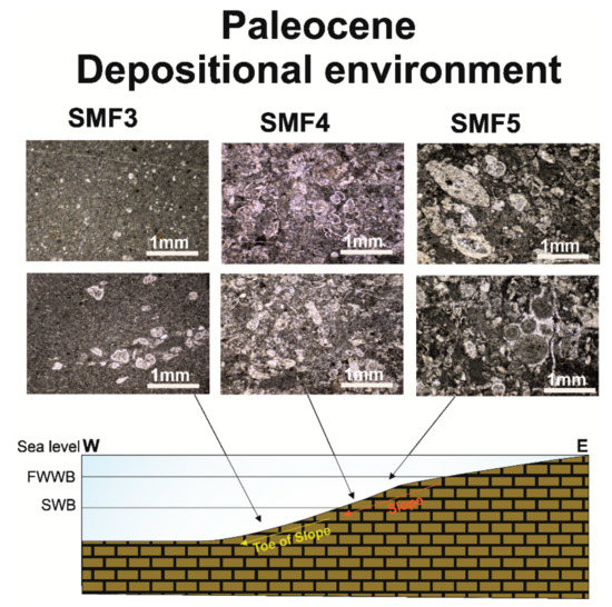 The Paleocene limestones of the study area have been classified as similar to the Maastrichtian limestones, represented by the three different Microfacies types SMF 3, SMF 4 and SMF 5 as well, and corresponding to two different depositional environments/Facies Zones: toe-of-slope (FZ: 3) and slope (FZ: 4), respectively.
