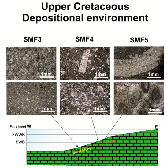 The SMF3 microfacies type represents carbonates which were deposited in a moderately inclined sea floor and basinwards in steeper slope environments. Such environments include depositional environments such as the toe-of-slope (Figure 21, Figure 22 and Figure 23) (deep shelf margin FZ3), where pelagic material occurs, admixed with fine-grained detritus moved off from adjacent shallower environments. Redeposited shallow-water benthos is also observed, found together with some deep-water benthic taxa and planktic foraminifera. These settings indicate a depositional environment below the wave base and at low oxygen level (water depths perhaps 200 to 300 m) [23].