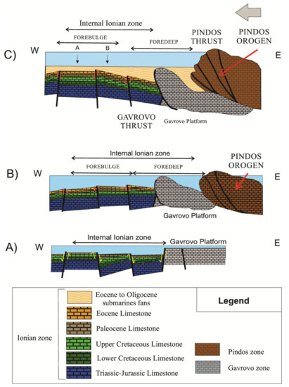 Evolutionary model of the studied part of the Ionian basin, illustrating the Maastrichtian-lower Eocene depositional conditions in the eastern part of the Ionian basin represented by three cross-sectional evolutionary stages. Stage (A) shows the depositional conditions during the rifting period (Jurassic-Paleocene). Stages (B) and (C) show the gradual formation and evolution of Pindos foreland basin during the compressional regime (Lower Eocene). Notice the gradual development of the forebulge area.