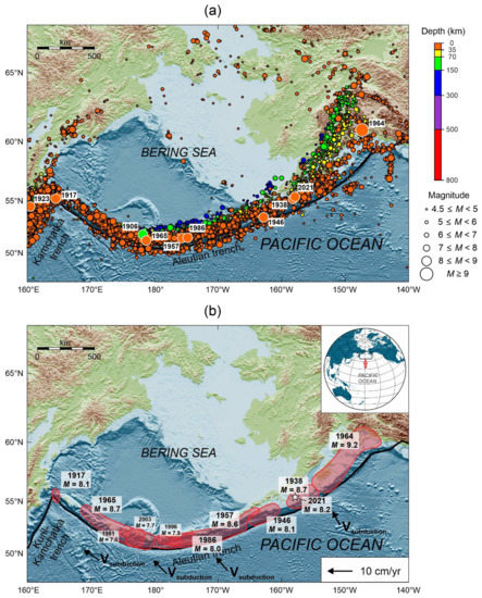(a) Regional seismicity map based on USGS catalog data (M > 4.5) [28]. The largest regional earthquakes (M ≥ 8) are denoted by white circles; (b) location of fault zones of the megathrust earthquakes in Alaska and the Aleutian island arc [29,36,37,38]. 1—subduction rates relative to the North American lithospheric plate (arrow scale is 10 cm/yr).