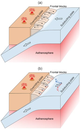 With oblique subduction, the lithospheric plates experience both frontal and lateral interaction. Non-zero tangential components of the plate convergence vector cause the shear stresses subparallel to the plates’ boundary to arise. In this case, most of the lateral displacement is transferred to the overhanging edge of the continental plate, which leads to the formation of strike-slip faults oriented both sub-parallel and sub-perpendicular to the subduction axis [4,5,6,7].