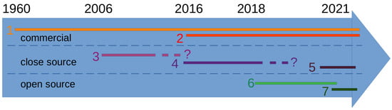 Overview of waves in ice instruments, distinguishing between (i) commercial instruments, (ii) closed-source instruments, (iii) open source. Commercial instruments have been available for a long time, in particular the Datawell Waverider series of instruments (1), which goes back all the way to the 1960s [48]. More recently, the Sofar Spotter (2) has become a viable, lower-cost alternative, though there are a number of limitations, particularly regarding battery autonomy [49] and the price. A number of groups have developed satellite-connected autonomous instruments that have been described in research articles, but that remained closed source. A few instruments we know about were released in 2006 (3) [47,50], 2016 (4) [40], and 2021 (5) [24]. By contrast, our group has decided to release our designs as open source, so that they can be freely used and improved by other groups, starting in 2018 (6) [51] and now with the present design (7).