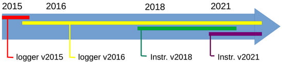 Full lineage of our present open-source instrument. Developing reliable autonomous instruments is a long-term effort. The development of our instrument can be tracked back to 2015 [41] and 2016 [21], though the instruments used at the time were simple loggers. Using loggers is still an attractive solution when the instruments can be recovered, and the logger v2016 design is still in use today. By contrast, our first truly autonomous, satellite-enabled instrument was designed in 2017–2018 [51], and the present instrument is the second iteration around this design.