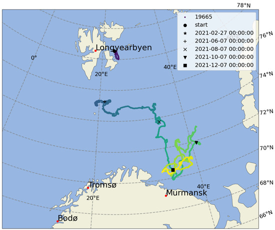 Overview of the drift trajectory of the early prototype instrument deployed in February 2021, East of Svalbard. The interruption in the trajectory is due to a layer of snow covering the instrument that prevented satellite communications during a couple of months. The instrument then drifted freely in the open ocean. This validates the low-power design and confirms that the chosen design is able to sustain operations for several months using just a few D-cell Lithium batteries.