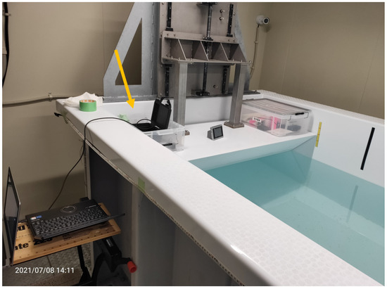 Illustration of the wavemaker experiment setup in the wave–ice tank of JAMSTEC (Japan Agency for Marine-Earth Science and Technology) at the Kashiwa campus of the University of Tokyo, Japan. The instrument v2021 location is shown by the yellow arrow.