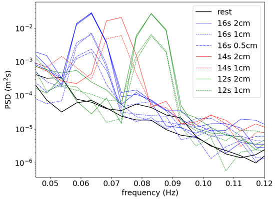 The spectra obtained during these tests, as well as two spectra corresponding to the instruments while at rest, are presented in Figure 5. As visible there, the noise background of the instrument increases slightly when motion is present, which may be explained by a variety of reasons (small vibrations in the wave paddle mechanism when it is undergoing displacement, diffusion of numerical noise in the processing algorithms, inherent properties of the 9-dof sensor). However, the increase in the noise threshold when there is motion remains very limited. The signal-to-noise ratio is superior or equal to a factor of 50 in all experiments, except for the smaller waves (0.5 cm at 16 s period), in which case the signal-to-noise ratio is around 10. This means that, even in this last “extreme” test case, the signal-to-noise ratio is still good enough to clearly distinguish the motion from the noise floor, though noise starts to be visible in the integrated statistics, as discussed in the previous paragraph and in Table 4.