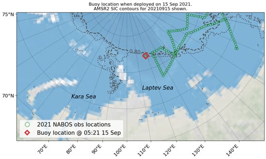On 15 September 2021, both buoys were deployed adjacent to the ice edge in the central Arctic Ocean (North of the Laptev Sea), at a location of 81.915 N 118.763 E, at around 05:05 UTC. The buoy deployment location is shown in Figure 6, which is overlaid with 0.15 and 0.80 sea ice concentration (SIC) contours based on the Advanced Microwave Scanning Radiometer 2 (AMSR2) data [62].