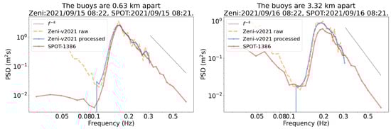 Comparison of Zeni-v2021 and SPOT-1386 spectra at 08:21 15 September 2021 (left) and 08:21 16 September 2021 (right): the distances between the buoys were roughly 1 km and 3 km, respectively. Low-frequency noise of Zeni-v2021 spectra was removed by applying an ideal filter at the lowest frequency local minimum of the smoothed spectrum, similar to what was reported in Waseda et al. [63], Nose et al. [64], which is a common postprocessing step when working with accelerometer-derived wave data. This indicates agreement within typically 5% between the Sofar Spotter and the instrument v2021 measurements in the open water, before the instruments drift away from each other.