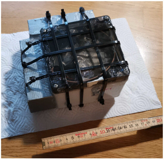 A small-scale, home-produced drifting buoy was built following the v2021 design in the context of the OneOcean expedition, a circumnavigation by the Norwegian tall ship Statsraad Lehmkuh. The electronics are identical to everything that was discussed above, except for the battery solution used. Indeed, since the instrument had to be transported by plane in the checked luggage of an expedition member, two traditional alkaline D-cell batteries were used instead of the Li-batteries of the other instruments. A standard rectangular rigid plastic enclosure of size 12 cm × 12 cm × 9 cm was used as the main body of the buoy. Since alkaline batteries are heavier than lithium batteries, this resulted in too low buoyancy. As a consequence, we added small chunks of styrofoam (wrapped in duct tape to protect from abrasion from the elements) on the sides of the rigid plastic enclosure in order to increase buoyancy. These additional buoyancy elements were set in place using cable ties and glued in position using bathroom silicone sealant. In addition, the rigid plastic box was fully sealed with epoxy glue, to make it completely watertight. Finally, a keel composed of diverse scrap metallic parts (spare screws and bolts), packed in duct tape, was fixed at the bottom of the plastic enclosure to improve its static stability. This combination of disparate building materials gave a very peculiar appearance to the drifting buoy, which got nicknamed humorously as “Floatenstein” (Floating-Frankenstein). A picture of the instrument, fully built before being shipped, is presented in Figure 8.