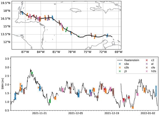 (Top): drift pattern of Floatenstein (colored continuous black line) and satellite measurement transects (colored points) over which wave characteristics are measured by the satellites. (Bottom): comparison of the Significant Wave Height (SWH) (i) reported by Floatenstein (continuous black line) and (ii) from satellite measurements on the corresponding measurement transects.