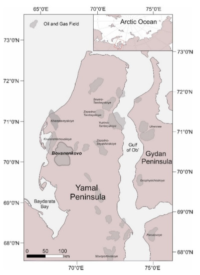 The Bovanenkovo gas field is located in the central part of the Yamal Peninsula (Figure 1). Its geological and geocryological conditions have been well studied [55,56,57].