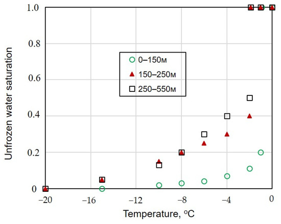 The well–permafrost interaction was simulated using data on the permafrost structure and physical properties from the Bovanenkovo gas-condensate field [51]. The modeling domain extended to a depth of 550 m, while the permafrost thickness was assumed to be ~210 m. The model consisted of three layers (Layer 1, Layer 2, and Layer 3), with different user-specified thermal properties and an unfrozen water content at <0 °C (Table 1; Figure 2).