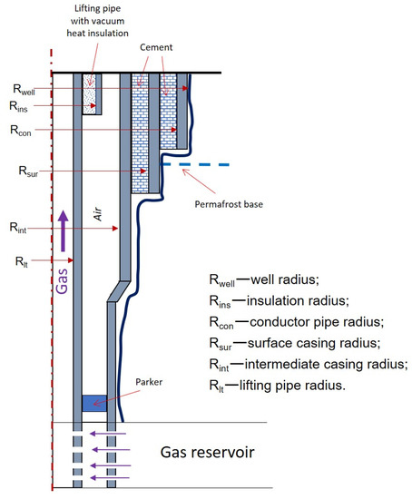 The modeling was performed for a three-string well, with a vacuum heat-insulated a gas lifting pipe to a depth of 55 m, which was embedded in permafrost containing gas hydrates in the 60–120 m depth interval. The model parameters and boundary conditions were chosen with reference to evidence from the Bovanenkovo gas-condensate field.