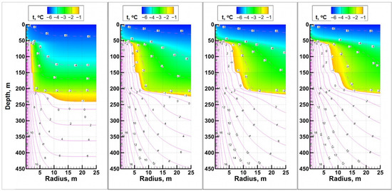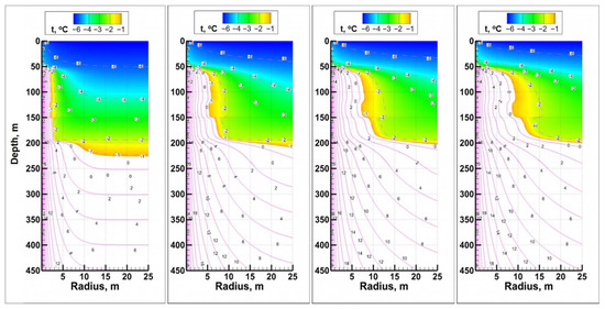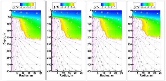 Permafrost temperature variations around a producing gas well (along the radius off the well center) after 1, 10, 20, and 30 years of operation (left to right). Permafrost contained gas hydrates within the depth interval of 60–120 m, with hydrate saturation = 20%; hydrate and ice saturation = 70%.