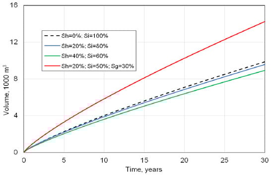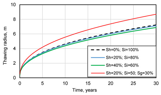 The thaw radius in permafrost-bearing gas hydrates depends on the total Sh + Si saturation (Figure 10), that is, about 25% larger in the case of = 70% than at = 100%. The reason is that the presence of free pore space filled with methane (30% in our case) decreased the phase transition enthalpy for both ice and gas hydrate and, thus, accelerated the thawing.