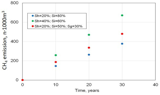 As predicted by the model, methane emission from permafrost that contained 20% of metastable pore gas hydrates could reach 400,000 to 500,000 m3 after 30 years of gas production, corresponding to a daily emission of 50 m3 (Figure 12).