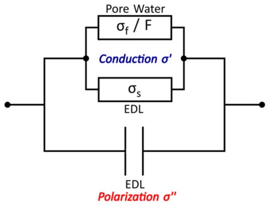 Simplified circuit diagram of charge transport in saturated rock [56]. The in-phase component of conductivity (σ′) is controlled by the ratio of fluid conductivity (σf) and the formation factor (F), and by surface conductivity (σs) along the electric double layer (EDL) on grain or phase boundaries. The quadrature component of conductivity (σ″) is controlled by polarization and other phenomena in the EDL, including surface conductivity [56].