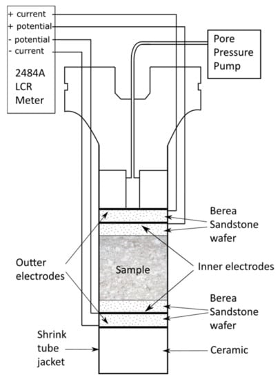 Experimental setup to test electrical resistivity across samples under effective confining pressure [61]. Resistivity was measured with an Agilent 4284A Precision Inductance Capacitance Resistivity LCR meter using a 4-electrode set up, where two outer electrodes drive current and two high impedance inner electrodes measure voltage decrease across the sample. The resulting voltage difference (∆V) was used to calculate resistivity by dividing ∆V by the length of the sample parallel to current flow. Electrodes were made of platinum mesh coated with platinum black and separated from the sample and each other by wafers of Berea sandstone. The assembled sample column, including the platinum electrode wires, were each jacketed in heat shrink tubing jackets. The sample column was connected to a pore pressure pump for independent pore fluid pressure control and suspended in silicon oil within the confining pressure apparatus to maintain electrical isolation [61]. Samples were saturated in a 0.1 M KCl brine and measurements were taken at a controlled temperature of 23.3 ± 0.3 °C, a constant pore pressure of 20 bar and at discrete frequencies 20 and 100 Hz.