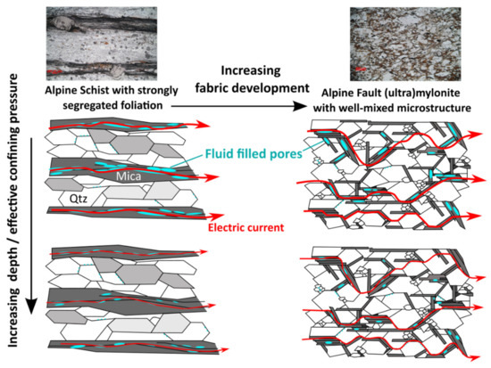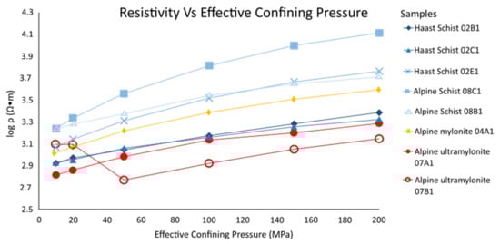 Charge transport is related to the geometry and spatial arrangement of pore networks and grain/phase boundaries. Consequently, the anisotropy of rock fabric influences the anisotropy of resistivity [58,59,60]. Because of this relation, changes in shear-strain or effective confining pressure (peff) have measurable effects on electrical properties [61]. As previously noted, Alpine Schist has highly anisotropic fabrics which manifest as a strong planar foliation of alternating micaceous and quartzofeldspathic domains. This planar foliation is reduced by mylonitization and mixing of phases approaching the AFZ [45,47,62]. The porosity of these Alpine mylonites comprises approximately equant etch pits and open crack-like compliant voids that are related to thermal contraction during exhumation [50,62,63,64]. Closure of exhumation cracks with increasing confining pressure can change the anisotropy of permeability by altering the preferred flow paths. This replicates the anisotropic behaviour of the rocks under in situ conditions, with an overall decrease in permeability generally described by a power function [59,60]. Since resistivity obeys a similar function to permeability under confining pressure [59], resistivity measurements should be made as close to in situ conditions as possible.